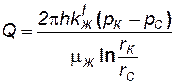 Расчетные формулы для дебита по закону Дарси имеют наиболее простой вид, когда жидкость однородна и несжимаема. Такова, например, формула Дюпюи для объемного дебита Q. Придадим формуле для объемного дебита жидкой фазы газированной смеси в плоскорадиальном потоке вид формулы Дюпюи, сохранив в ней неизменным множитель рк - рс.