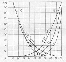 Результатом опытов Леверетта явились кривые, представленные на рис. 5.6. По оси абсцисс отложены значения водонасыщенности s в процентах, по оси ординат – относительная фазовая проницаемость для воды и нефти в процентах. Каждая кривая отвечает определенному значению параметра a = p ΔL/d Δ p, где p – давление вытеснения в см рт. ст., Δ L – длина колонки песка в см, d – средний диаметр поровых каналов в см и Δ p –перепад давления в см рт. ст. Параметр a пропорционален капиллярным силам, противодействующим прохождению отдельных капель нефти через поры песка.