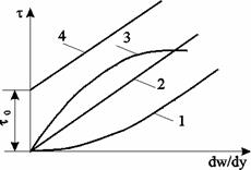 жидкость: 1 – дилатантная; 2 – ньютоновская; 3 – псевдопластичная; 4 – вязкопластичная