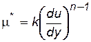 2. Псевдопластичные жидкости. Эксперименты показали, что для ряда сред связь между напряжением сдвига и градиентом скорости в логарифмических координатах оказывается на некотором участке линейной с угловым коэффициентом от 0 до 1. Поэтому для описания таких сред используется степенная зависимость
