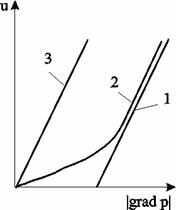 1 – линейная аппроксимация неньютоновской жидкости; 2 – реальная неньютоновская жидкость; 3 – ньютоновская по закону Дарси