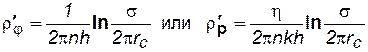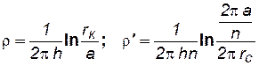 Здесь r выражает фильтрационное сопротивление потоку от контура питания к кольцевой батареи радиуса а в предположении, что поток плоскорадиален и батарея заменена галереей. Внутреннее сопротивление r / – это сопротивление плоскорадиального потока от воображаемого контура окружности длиной 2pа/n к скважине. Величина 2pа/n – длина дуги сектора радиуса а, который содержит одну из скважин батареи.