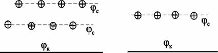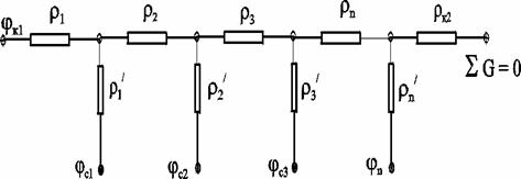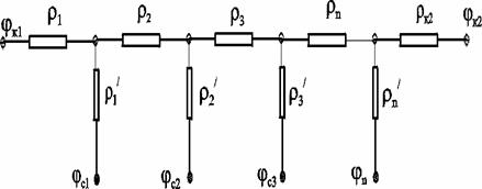 Рассмотрим случай притока к n эксплуатационным и нагнетательным батареям скважин и составим схему сопротивлений. Предположим, что скважины i - йбатареи имеют забойные потенциалы jсi (i = 1,...,n), пласт имеет контурные потенциалы jк1и jк2(рис. 7.14). Пусть jк1 > jк2. Очевидно, поток от контура питания к первому ряду скважин будет частично перехватываться первой батареей и частично двигаться ко второй. Поток ко второй батарее будет частично перехватываться второй батареей, частично двигаться к третьей и т.д. Этому движению отвечает разветвленная схема фильтрационных сопротивлений (рис. 7.15).