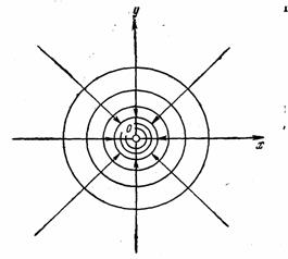 Очевидно, эквипотенциальные линии будут концентрическими окружностями с центром в начале координат (рис. 7.22). Линии тока – прямые, проходящие через начало координат.