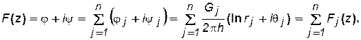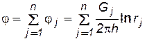 где Gj – массовый дебит стока или источника за номером j; r j – расстояние любой точки плоскости потока до этого стока или источника; n – число стоков и источников.