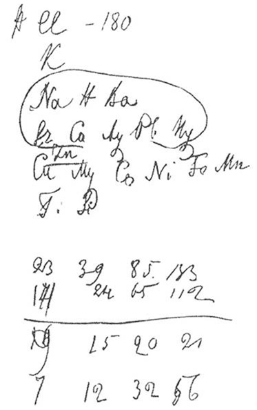 On the 17th of February Mendeleev decided against going on a consultancy visit to a local cheese co-operative in order to stay at home to work on his book. It appears that at some point in the morning he took the invitation to the cheese co-operative and turned it over in order to sketch some ideas about what elements to treat next in his book (figure 1). This document still exists in the Mendeleev Museum in St. Petersburg and it is frequently brought out of the coffers for visiting documentary film-makers wanting to capture Mendeleev’s crucial moment of discovery.