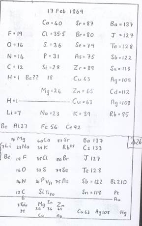 *In fact Mendeleev is using twice the value of the atomic weight of lithium which is seven, hence the value of 14. This seems to be an afterthought since the numbers written underneath 14 and 9 seem to be 7 and 16 in which Mendeleev considered the actual value of lithium, namely 7.