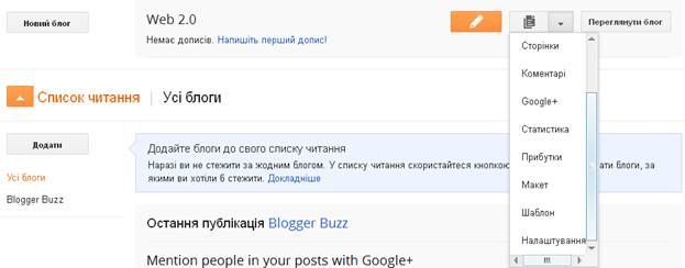 8. Для налаштування шаблону оформлення блогу перейдіть на вкладку Шаблон; для перегляду статистики переглядів та аудиторії – Статистика – Аудиторія; для додавання та видалення гаджетів на сторінці – пункт Макет.