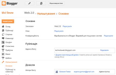 6. Відкрийте налаштування створеного блогу (Рис. 1.5.).