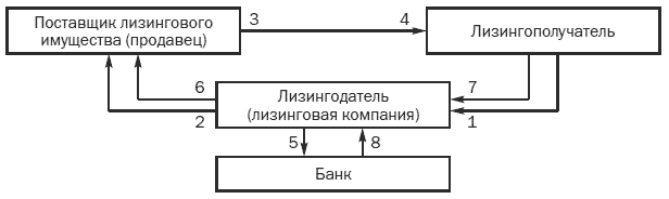 Рис. 1. Технология лизинговой сделки (1–8 — см. в тексте)
