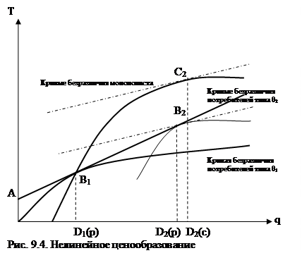 Прямая линия представляет оптимальный двуставочный тариф T(q) = A + Pq. Кривые безразличия потребителей двух типов вогнутые. Поскольку θ2 > θ1, кривая безразличия потребителей типа θ2 круче, чем кривая безразличия потребителей типа θ1 в точке их пересечения. При оптимальном двуставочном тарифе потребители типа θ1 выбирают набор В1, а потребители типа θ2 – набор В2. По построению потребители с более низким спросом не имеют чистого излишка (их кривая безразличия, проходящая через В1, проходит и через начало координат), в то время как потребители с более высоким спросом имеют положительный чистый излишек. На рис. 9.4 также изображены кривые безразличия монополиста (Т – сq = const). Поскольку с < p, эти кривые безразличия более пологие, чем оптимальный двуставочный тариф.