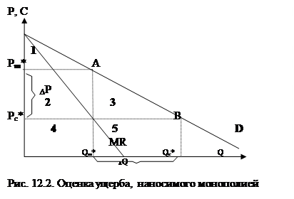 Потеря оптимальности в случае монополии поднимает вопрос об оценке ущерба наносимого монополией обществу. Рассмотрим для начала, каким образом можно оценить этот ущерб (см.: рис. 12.2).