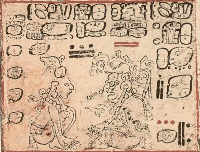 D9b, іі. Знак Т1050 передаёт имя "бога Q" по П. Шелльхасу (по Ю.В.Кнорозову – бог войны). В параграфах D8с и М84с этот знак употреблён с конечным фонетическим подтверждением -ni, откуда чтение CNAAN (бог Лахун Чаан известен в текстах колониальной поры). С другой стороны, в параграфе 52(58)а Мадридской рукописи встречается запись Т585.1050, bi-…, которая может указывать на чтение BI...N. Однако, бог Лахун-Чаан достаточно часто упоминается в индейских текстах, в то время как персонаж по имени «Лахун Би...н» в источниках совершенно неизвестен. Скорее всего, копиист пестрящего ошибками Мадридского кодекса перепутал порядок знаков и сначала написал числительное «10», пропустив знак Т585, а затем, так как пространства на листе для этого знака уже не было, написал пропущенный знак. В таком случае мы имеем вполне осмысленный текст: u-CHAM WIN?-BAK bi 10-CHAAN, «смерть от Костлявого, когда в дороге Лахун-Чаан» (в сопроводительной сцене "бог Q" изображён идущим с копьем и амуницией за плечами).
