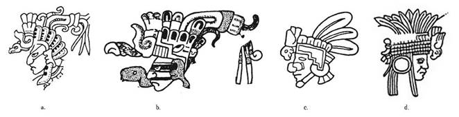 Рис. 9. a. Голова полководца из подпараграфа D60b; b. Голова Шиутекутли со стр. 28(49) Дрезденской рукописи; c. Голова тольтекского воина на колонне из пирамиды В в Тула-Шикокотитлане; d. Голова тольтекского воина на рельефе из «Нижнего Храма Ягуара» в Чичен-Ица (все – по К.А.Таубе)