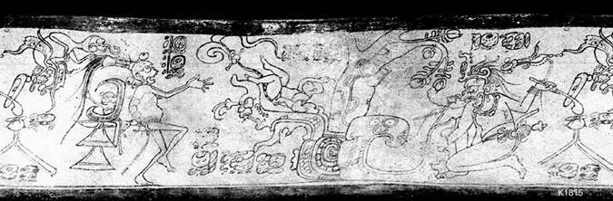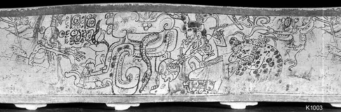 Ваза №1003 по каталогу Дж. Керра. Справа – Чаак и его спутник, «Ягуар Водяной Лилии», слева К’авииль в ипостаси «Младенца-Ягуара», летящего кувырком в объятия «Скелета с Косой» (за спиной у того отрубленная голова Бога Кукурузы). Иероглифический текст в сцене сообщает: 7*-MULUK 7-TE’-K’AN-a-la ya-YAL-wa K’AWIIL, «В день 7 Мулук 7 К’айаб он тот, кто сбросил К’авииля».