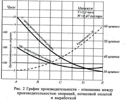 Ни Т, ни W не могут сокращаться беспредельно, так что мы должны экспериментально определить, при каких именно значениях этих величин произведение будет давать минимальный расход. На рис.2 вертикальные линии A,B,C,D,E означают разных рабочих, выполнявших с разной скоростью одну и ту же операцию. Самый медлительный из них (А) заканчивает эту операцию за десять часов