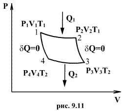 Французский ученый С. Карно рассмотрел идеализированный цикл тепловой машины, рабочим телом которой является идеальный газ, находящийся между нагревателем с температурой Т1 и холодильником с температурой Т2. Этот цикл составлен из определенной последовательности обратимых процессов.