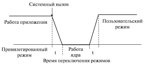 Повышение устойчивости ОС обеспечивается переходом ядра в привилегированный режим. При этом происходит некоторое замедление выполнения системных вызовов. Системный вызов привилегированного ядра инициирует переключение процессора из пользовательского режима в привилегированный, а при возврате к приложению – обратное переключение. За счет этого возникает дополнительная задержка в обработке системного вызова (рис. 1.5). Однако такое решение стало классическим и используется во многих ОС (UNIX, VAX, VMS, IBM OS/390, OS/2 и др.).