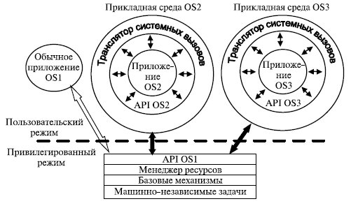 На рис. 1.9 ОС OS1 поддерживает кроме своих "родных" приложений приложения операционных систем OS2 и OS3. Для этого в её составе имеются специальные приложения, прикладные программные среды, которые транслируют интерфейсы "чужих" операционных систем API OS2 и API OS3 в интерфейс своей "родной" ОС – API OS1. Так, например, в случае если бы в качестве OS2 выступала ОС UNIX, а в качестве OS1 – OS/2, для выполнения системного вызова создания процесса fork () в UNIX-приложении программная среда должна обращаться к ядру операционной системы OS/2 с системным вызовом DOS ExecPgm ().