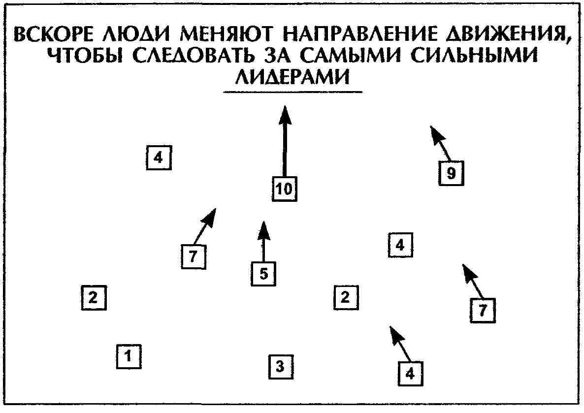 Посмотрите, что случается, когда люди впервые собираются вместе как -единая группа. По мере того как они начинают взаимодействовать между собой, в группе выявляются лидеры, которые и берут на себя контроль над происходящим. Эти люди мыслят в терминах направления, в котором они желают двигаться, и тех спутников, которых хотят забрать с собой. Поначалу члены такой группы могут делать пробные шаги в нескольких разных направлениях, но после того как все узнают друг друга получше, им не требуется много времени, чтобы распознать самых сильных лидеров и последовать за ними.
