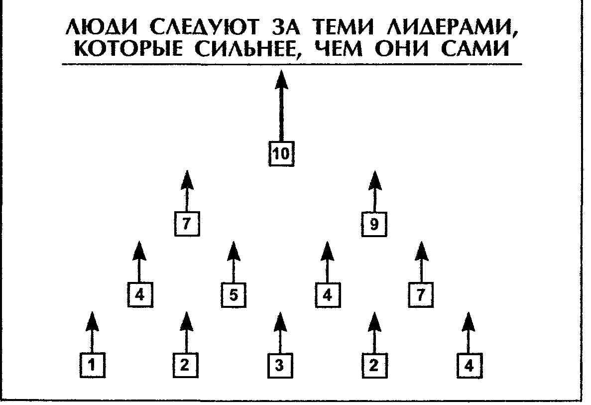 Не бывает, чтобы люди следовали за другими просто так, случайно. Они следуют за теми личностями, чье лидерство уважают. Человек, у которого способности к лидерству составляют 8 баллов (по 10-балльной шкале), не пойдет искать в качестве лидера того, у кого они равны 6, — естественно, он последует за лидером с показателем в 9 или 10 баллов. Менее квалифицированные следуют за более квалифицированными и одаренными. Эпизодически бывает, что сильный лидер может выбрать вариант следования за кем-то более слабым, чем он сам. Но когда подобное случается, на то должна -существовать какая-то веская причина. Например, более сильный лидер может поступить так из уважения к должности данного человека либо к его прошлым заслугам. Или же он может просто соблюдать субординацию. В общем, однако, правило таково: последователей притягивают лишь те люди, которые являются лучшими лидерами, чем они сами. Это и есть закон уважения.