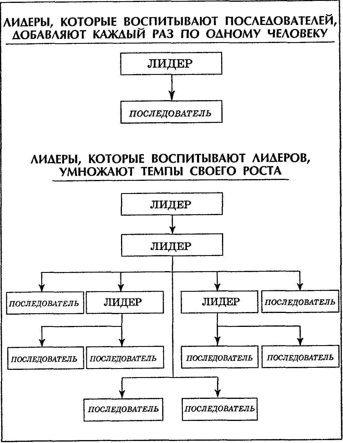 Вот как она работает. Лидеры, воспитывающие последователей и приверженцев, всякий раз обеспечивают рост своей организации только на одного человека. Зато те лидеры, которые воспитывают лидеров, многократно умножают темпы роста, потому что вместе с каждым выращенным ими лидером они получают в свои ряды также и всех его поборников. Добавьте в свою организацию десять последователей — ив вашем распоряжении окажутся силы и возможности этих десяти человек. Пополните свое учреждение десятью лидерами — и вы будете располагать силами и возможностями указанных десяти лидеров, умноженными на число всех тех поборников и лидеров, на которых они влияют. Здесь имеет место такое же различие, как между сложением и умножением. Получается так, как если бы ваша организация пополнялась не отдельными индивидуумами, а целыми командами или бригадами.'Чем лучших лидеров вы воспитываете, тем выше качество и количество их — а значит, и ваших — последователей.