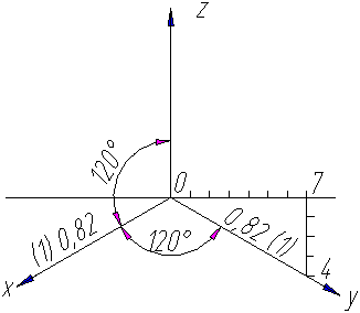 Следовательно, для изометрических проекций будем иметь следующие приведенные коэффициенты искажений: