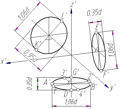 Построение в диметрической проекции отличается от построения в изометрической только тем, что по оси у’ и линиям, ей параллельным, откладывают отрезки вдвое меньшей длины, чем на комплексном чертеже. Эллипсы, являющиеся приведенными прямоугольными диметрическими проекциями окружностей, лежащих в координатных плоскостях или в плоскостях, им параллельным, изображают так, как показано на (рисунок 8.5). Длина большой оси каждого из эллипсов равна 1,06 диаметра окружности. Длина малой оси эллипса, соответствующего окружности, лежащей в плоскости xOz, равна 0,95 диаметра окружности, а для эллипсов, соответствующих окружностям, лежащим в плоскостях хОу и yOz, равна 0,35 диаметра окружности.