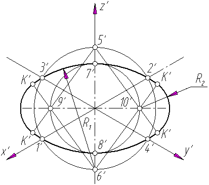 Для упрощения построения эллипса в аксонометрической проекции их заменяют овалами, очень близкими по начертанию (рисунок 8.6). Примем точку О' за центр вспомогательной окружности равной диаметру заданной окружности. Вспомогательная окружность пересечет аксонометрические оси по точкам:1',2',3',4',5',6'. Точки 5' и 6' принимают за центры дуг радиуса R1=5'1' =6'3', эти дуги пересекут ось z ' в точках 7' и 8'. Отрезок 7' 8' является малой осью овала. На большой оси овала строят точки 9' и 10', отстоящие от О' на расстоянии равной величине половины малой оси овала. Через точки 5' и 9', 6' и 9', 5' и 10', 6' и 10' проводят прямые линии до пересечения в точках К' с дугами 3' 7' 2' и 1' 8' 4'.Точки 9' и 10' принимают за центры дуг радиусом R2 = 9' К' =10' К' и проводят замыкающий овал дуги.