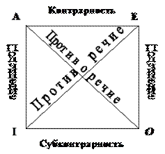 Между суждениями A, E, I, O с одинаковым терминами (с одинаковой материей) существует четыре вида отношений: