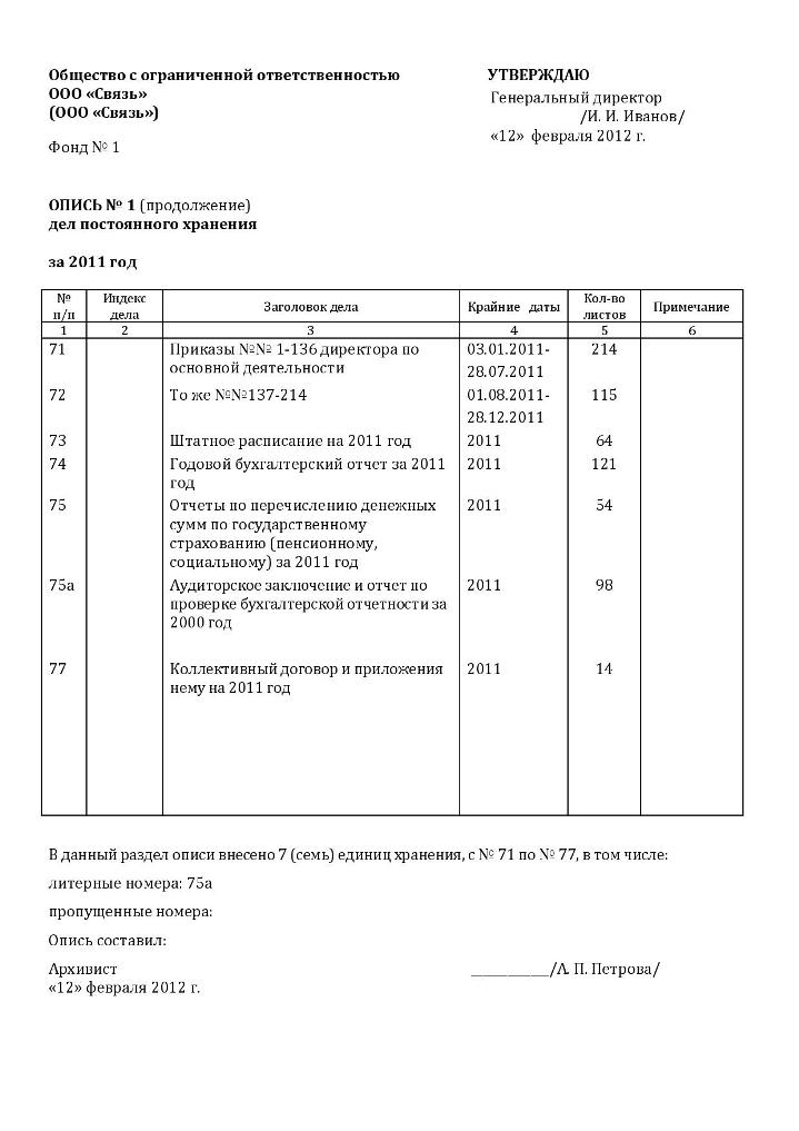 Заголовок вносится в опись в точном соответствии с заголовком, который находится на обложке дела. Никакие расхождения не допускаются. Для дел с одинаковыми заголовками существует следующий порядок: полностью прописывается наименование только первого дела, а все остальные обозначаются словами «То же».
