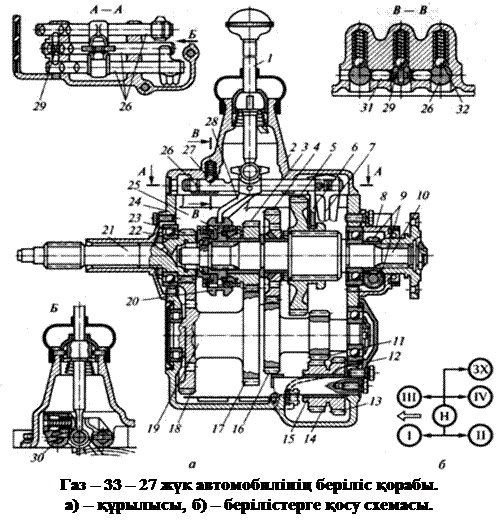 Берілісті ауыстыру рычагын 1, жылжымадағы пазаның 26 орындарында ашамен тісті дөңгелектерді қозғалту арқылы жүргізіледі.