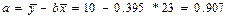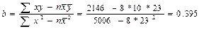 b = 815 – 5*3*52,2/55 – 5*32 = 3,2; a = 52,2 – 3,2*3 = 42,6