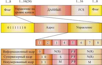 HDLC относится к бит ориентированным протоколам (любой передаваемый кадр может содержать произвольное число битов, не обязательно кратное 8). Единица данных, передаваемая как целое через информационный канал, организуемый средствами управления уровня 2, называется кадром. Кадр рассматривается как последовательность байтов (октетов), начало и конец которой отмечаются флагами – двоичными кодами “01111110”. Кадр несет в себе управляющую информацию, данные и проверочную последовательность, используемую для контроля передаваемой информации.