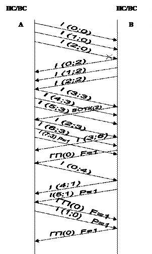 После установления соединения и режима работы АСР, ПС и ВС могут начать передачу кадров в любое время и при этом каждая станция будет проверять принимаемые от другой станции кадры на наличие ошибок. Если кадры принимаются верно, то на запрос идет подтверждение ГП, если с ошибкой, то идет выборочный отказ ВОТК от того кадра где была ошибка и будет произведена повторная передача этого кадра.