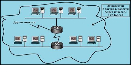 Сети присвоен адрес класса C 201.222.5.0. Предположим, необходимо организовать 20 подсетей по 5 хостов в каждой. Можно разделить последний октет на части подсети и хостов и определить, какой вид будет иметь маска подсети. Размер поля подсети выбирается исходя из требуемого количества подсетей. В этом примере выбор 29-битовой маски дает возможность иметь 221 подсеть. Адресами подсетей являются все адреса, кратные 8 (например, 201.222.5.16, 201.222.5.32 и 201.222.5.48).