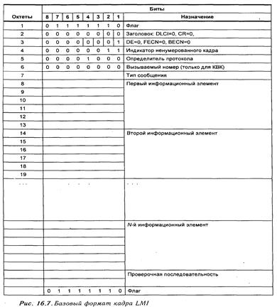 Интерфейс LMI согласован с базовым стандартом FR относительно логической и процедурной характеристик последнего. Базовый формат кадра LMI представлен на рис. 16.7.