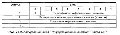 Информационные элементы. Для информационных элементов кадра LMI отводится один или больше октетов в пределах последнего, то есть информационные элементы имеют переменную длину. Формат поля элемента информации представлен на рис. 16.9.