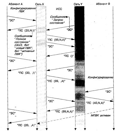 ИСС. АКД Yc (АКД сети Y со стороны АКД X) на свой первый "Запрос состояния" получает от АКД Хд (АКД сети Х со стороны АКД Y) ответ "Полное состояние", в котором указывается, что сконфигурирован новый ПВК (отрезок ПВК), имеющий DLCI 99, и этот ПВК является активным "внутри" сети X. Ввиду того, что в ИСС используются асинхронные двунаправленные процедуры управления, АКД Хс также посылает АКД Yс "Запрос состояния", в ответе на который ("Полное состояние") не указываются никакие новые ПВК (за исключением ранее установленных ПВК), причем до тех пор, пока отрезок ПВК (сеть Y) не будет сконфигурирован. АКД Хс на последующие запросы АКД Yc будет по-прежнему отвечать сообщениями "Полное состояние", в которых указывается, что внутри сети Х имеет место "активный" ПВК (DLCI 99). Однако этот ПВК не будет идентифицироваться как новый.