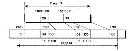 Кадр SLIP структуры не имеет, он только предусматривает разграничение последовательно передаваемых пакетов IP и тем самым обеспечивает синхронный ввод пакетов в канал связи (физический уровень). Для этого в протоколе SLIP используется специальный символ “ END”, значение которого в шестнадцатеричном представлении равно “С0” (11000000). В случае если в пакете IP имеется байт, тождественный символу “END”, то он заменяется двухбайтовой последовательностью, состоящей из специальных символов “ ESC ”(“DB”-11011011) и “DC” (11011100). Применяемый в протоколе SLIP символ “ESC” не равен символу “ESC” в коде ASCII, поэтому обозначают его “SLIP ESC”. Если же байт данных тождествен символу “SLIP ESC”, то он заменяется двухбайтовой последовательностью, состоящей из собственно символа “SLIP ESC” и символа “DD” (11011101). После последнего байта пакета IP передается символ “ END”.