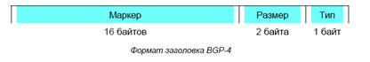 Поле маркера длиной 16 байт используется для аутентификации входящих сообщений BGP либо для детектирования потери синхронизации между двумя взаимодействующими по BGP маршругизаторами. Поле маркера бывает двух форматов: