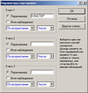 Шаг 2. В появившемсяокне (рисунок 4.35)необходимо указать по какой переменной производится сортировка, в данном случае это КЛАСТЕР (как видим на рисунке 4.35, существует также возможность сортировать по нескольким переменным).