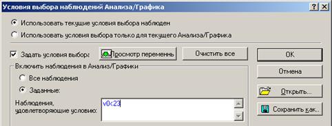 Шаг 5. В появившемся окне Условия выбора наблюдений Анализа, выделим Задать условия выбора ® Заданные и в поле Наблюдения, удовлетворяющие условию укажем v0 <23 (рисунок 4.36), т.е. корреляционные показатели будут рассчитываться на основе не всей совокупности, а лишь на основе первых 22 значений (что соответствует наблюдениям попавшим в первый кластер).