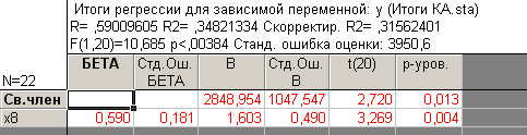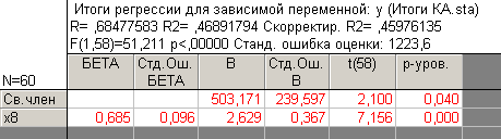 Рисунок 4.38 - Результаты оценивания парного линейного уравнения регрессии по первому кластеру с фактором x8