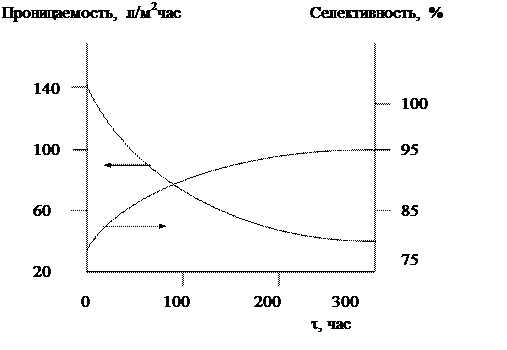 Рисунок 1 – Зависимость проницаемости и селективности мембран от времени