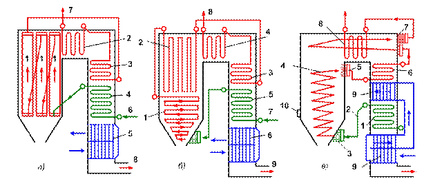 б) – Зульцера: 1- горизонтальные панели экранов; 2 – вертикальные панели экранов; 3 – вынесенная переходная зона испарения; 4 – пароперегреватель; 5 – экономайзер; 6 – воздухоподогреватель; 7 – ввод питательной воды; 8 – вывод перегретого пара; 9 - вывод продуктов сгорания;
