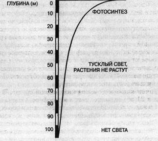 Световой режим водной среды существенно отличается от среды наземно-воздушной. В воде света мало, так как он частично отражается от поверхности и частично поглощается при прохождении через толщу воды. Прохождению света препятствуют и взвешенные в воде частицы. В глубоких водоемах в связи с этим выделяют три зоны: световую, сумеречную и зону вечного мрака (рис. 4).