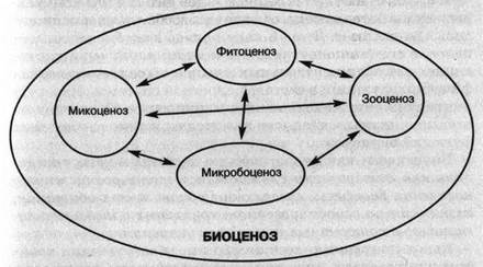 Биоценоз — не простая совокупность живых организмов, а согласованная, динамическая, уравновешенная, взаимосвязанная, стойкая во времени система, состоящая из фитоценоза (совокупность растений), зооценоза (совокупность животных), микоценоза (совокупность грибов) и микробоценоза (совокупность микроорганизмов) (рис. 18).