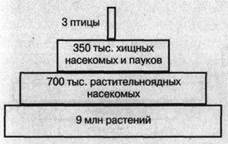 3) Пирамида численности отражает число организмов по трофическим уровням, причем численность особей при движении от продуцентов к консументам различного порядка значительно уменьшается. Например, на 1 га луга на I уровне находится около 9 млн растений; на II уровне — 700 тыс. растительноядных насекомых; на III уровне — 350 тыс. хищных насекомых и пауков; на IV уровне — 3 птицы (рис. 27, а, б).
