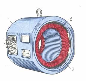 Неподвижная часть машины называется статор, подвижная – ротор. Сердечник статора набирается из листовой электротехнической стали и запрессовывается в станину. На рис. 2.1 показан сердечник статора в сборе. Станина (1) выполняется литой, из немагнитного материала. Чаще всего станину выполняют из чугуна или алюминия. На внутренней поверхности листов (2), из которых выполняется сердечник статора, имеются пазы, в которые закладывается трёхфазная обмотка (3). Обмотка статора выполняется в основном из изолированного медного провода круглого или прямоугольного сечения, реже – из алюминия.